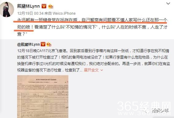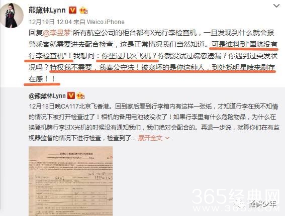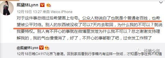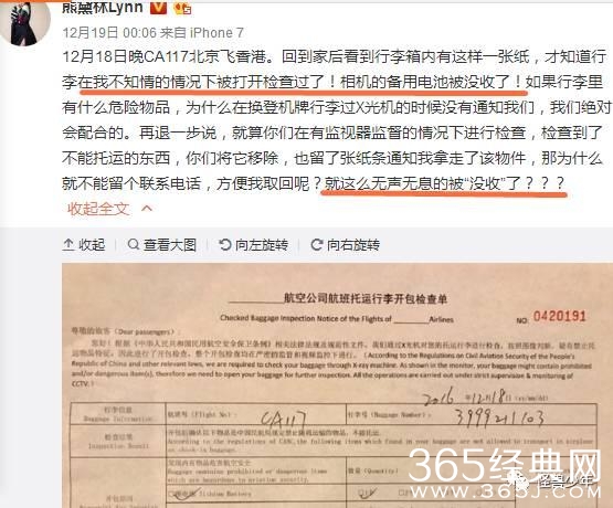 熊黛林上周坐飞机从北京飞香港,发现在没有被通知的情况下,行李被打开检查,相机的备用电池被没收了,Lynn发现后,微博狂轰航空公司不道德。