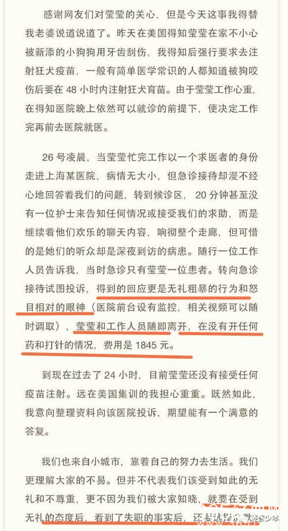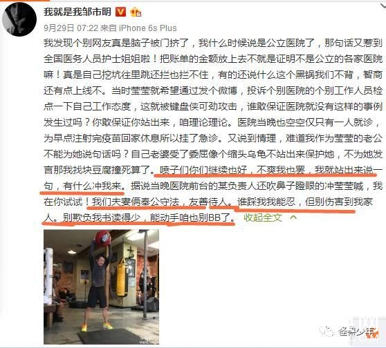 看到老婆被欺负,邹市明也发微博叙述了整件事的来龙去脉。冉莹颖在医院遭到粗暴无礼冷漠对待后,在没有人和吃药打针的情况下,医院还收到1845元。