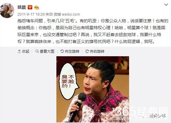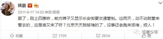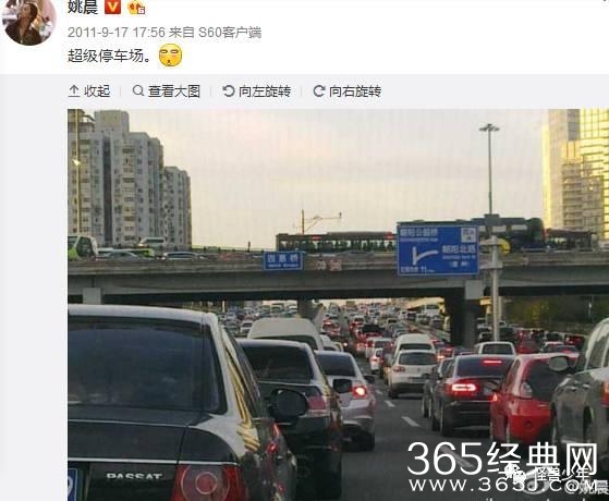 2011年9月17日,姚晨在微博抱怨北京的交通拥挤,还po出一张堵车的照片。