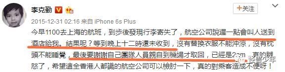 李克勤2015年12月31日,李克勤的行李被航空寄失,气愤的他凌晨两点多还没睡,发微博抱怨↓↓↓