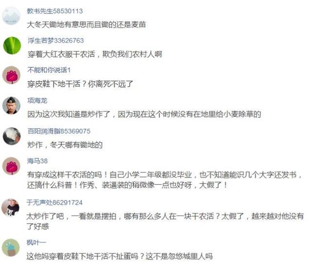 有网友针对衣服说:“穿着大红衣服干农活,欺负我们农村人啊!”有网友针对鞋子称:“穿着皮鞋下地干活,这不是忽悠城里人吗?”有网友根据天气称:“大冬天锄地有意思,而且锄的还是麦苗。”也有网友针对锄地人数讽刺道:“一看就是摆拍,哪有那么多人在一块干农活?”