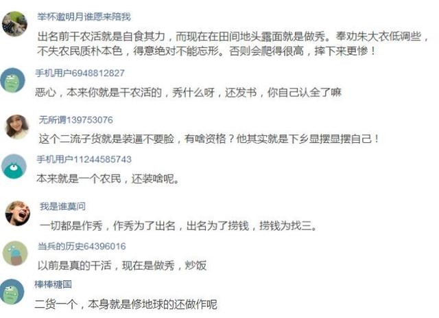对此,有网友对朱之文此次的下地锄草表示:“他其实就是瞎想来显摆显摆自己!”有网友讽刺道:“本来你就是干农活的,秀什么呀,还发书,你自己认全了吗?”也有网友劝诫道:“出名前干农活就是自食其力,而现在在田间的抛头露面就是作秀。奉劝朱大衣低调些,不失农民质朴本色,得意绝对不能忘形。否则会爬得很高,摔下来更惨!”