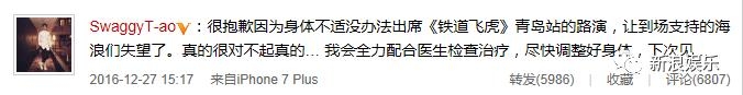 到现在身体还没有恢复过来呢,今天缺席电影路演,你韬还特意发了微博道歉。