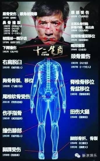 之前有粉丝总结过成龙从影这么多年来受过的伤,基本上全身上下都“中过”!