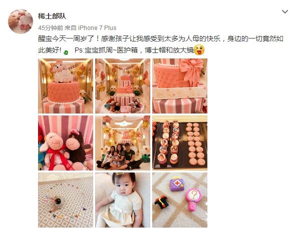 章子怡发微博:醒宝今天一周岁了!感谢孩子让我感受到太多为人母的快乐,身边的一切竟然如此美好!Ps:宝宝抓周~医护箱,博士帽和放大镜。