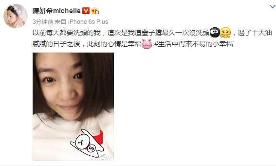 12月27日,陈妍希在微博中发图,回应自己不坐月子的传言,博文称:“以前每天都要洗头的我,这次是我这辈子撑最久一次没洗头,过了十天油膩膩的日子之后,此刻的心情是幸福[兔子] #生活中得来不易的小幸福”,图片中,陈妍希一头短发,活泼可爱,散发母性的气息。