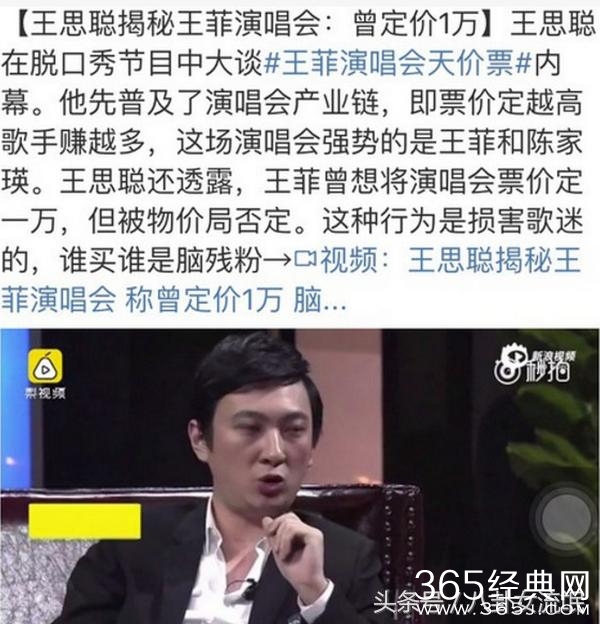 素有“娱乐圈纪委”的王思聪,曾在脱口节目中揭露王菲演唱会天价票的内幕,在科普演唱会产业链与商业运作时说,票价越高王菲与陈家瑛就赚的越多。同时还透露王菲为了疯狂敛财,不仅把原价7800的内场票炒到几万甚至十几万,甚至最开始还想将演唱会的票价定到10000元,后被物价局否决。并表示:“这种损害歌迷的天价票演唱会门票,谁买谁是脑残粉。”!