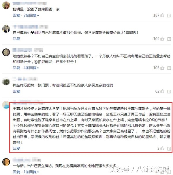 关于王菲演唱会天价票问题,有网友表示:“王菲及其经纪人陈家瑛太贪婪!记得当年听王菲的演唱会时,买的第一排的票,用辛苦赚来的钱,看了一场无聊无趣至极的演唱会,全场王菲只说了两三句话,没有更换过演出服,有时索性脱了鞋穿着丝袜在台上唱,有时又拿瓶矿泉水在台上喝,完全是唱卡拉OK的节奏!至今想起那场演唱会都心疼自己的钱包!其实王菲演唱会永远都是翻唱的那几首老歌,这么多年也没有看到她有什么新作品问世,凭什么把票炒作的那么高?也太拿自己当明星了,一点也不把爱她的粉丝当回事,恶很很的收割粉丝!希望其他的粉丝吸取教训,别再给这种极端自私的明星机会,都去退票吧!”