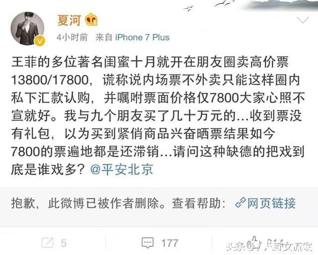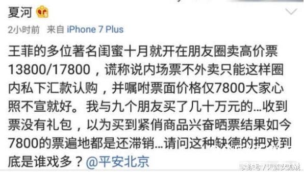 据网红夏河爆料:“王菲的多位著名闺蜜10月份就在朋友圈卖13800-17800的高价票,并放话这是官方不对外售的票,只供圈内人士,观众买不到。可是实际上花高价买到的票却都不理想。”