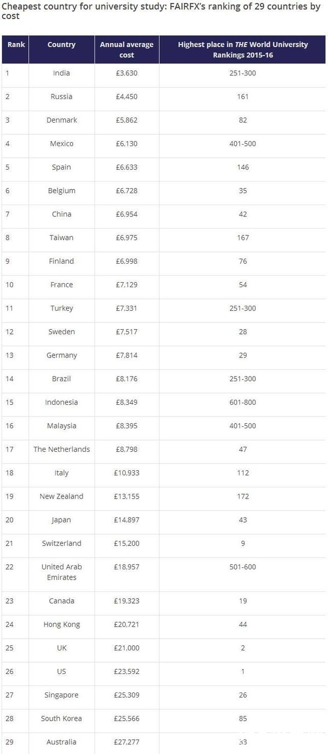 英国泰晤士高等教育(Times Higher Education,简称THE)联合旅行货币兑换公司FairFX统计了2015-2016学年全球各国的留学费用,并得出了一份全球最贵和最便宜留学国家排行榜。
