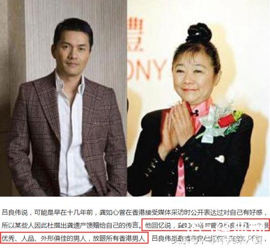 之后龚如心去世,她的丈夫早逝,又没有子女,巨额遗产的去向被外界怀疑被吕良伟秘密继承,对此曾多次有媒体记者当众质问吕良伟,但得到的均是一抹绅士的微笑。