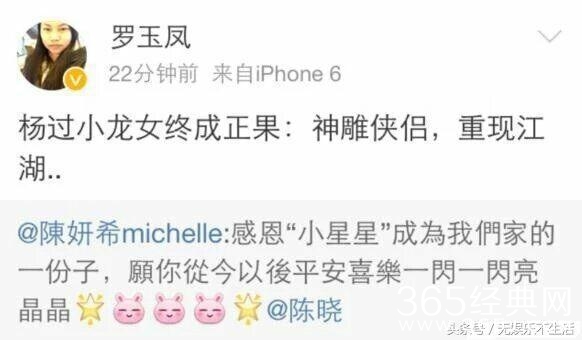 陈妍希和陈晓结缘于《神雕侠侣》,之后两人修成正果。12月20日,陈妍希顺利诞下8斤重的儿子“小星星”,当天下午,其微博晒出一张一家三口的照片,萌到了我们。