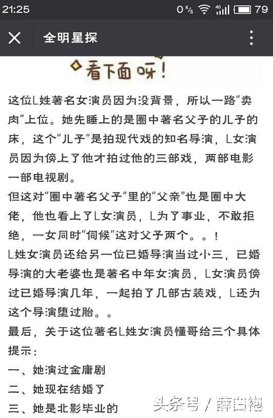 而爆的最好的的一个料,是和一个叫董哥的人互动时爆出的,一个女明星L为了上位,一路卖肉,曾陪父子两个导演,而且这位明星还演过金庸剧,问题来了,这位代号L的女明星是谁。