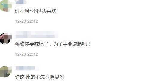 不少粉丝也表示蒋欣应该为了事业减肥了,还有粉丝称好壮啊!不过我喜欢!真爱粉不就是这样,不论你变成什么样子,我们都喜欢。