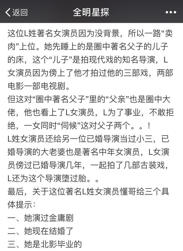 卓伟就是给人遐想空间,只爆出此女明星为L姓,北影毕业(看来又给北影争光了),演过金庸剧(金庸老先生给了女明星许多机会啊),已经结婚生子。不过此女还堕过胎,但不知道是“父子”的还是“名导”的,估计连此女自己也不知道吧。