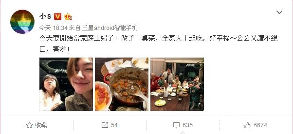 小s最近也开始当起家庭主妇,做了一桌菜,全家人一起吃,公公赞不绝口。为毛我只看见了西红柿炒蛋,为毛每次都只有公公一个人赞不绝口。看了黄磊家的晚餐再来看小S家的,真的好没有食欲有没有!不过,网友说得对,不管菜品如何,菜做得好不好吃,小S在家下厨陪伴公公婆婆,这份孝心是难能可贵的,对不对! 就冲这份孝心就该为她点赞!