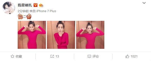 照中古力娜扎扎个冲天辫,还双手捏住自己的耳朵,看照身材确实不错。