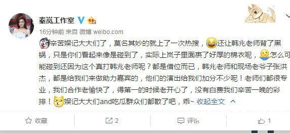 申明的原文:“辛苦娱记大大们了,莫名其妙的就上了一次热搜,还让韩兆老师背了黑锅,只是你们看起来像是碰到了,实际上岚子里面裹了好厚的棉衣呢,怎么可能碰到还因为这个真打韩兆老师呢?都是借位而已。”
