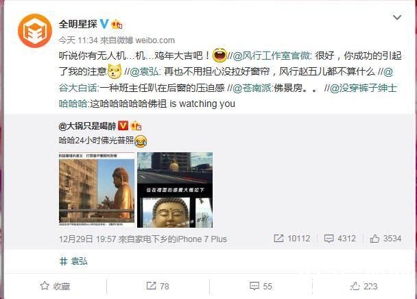 很快,袁弘就引起了风行工作室的注意。风行工作室转发并评论了他的微博:“ 很好,你成功的(地)引起了我的注意。”全明星探随即转发表示:“听说你有无人机……机……鸡年大吉吧!”