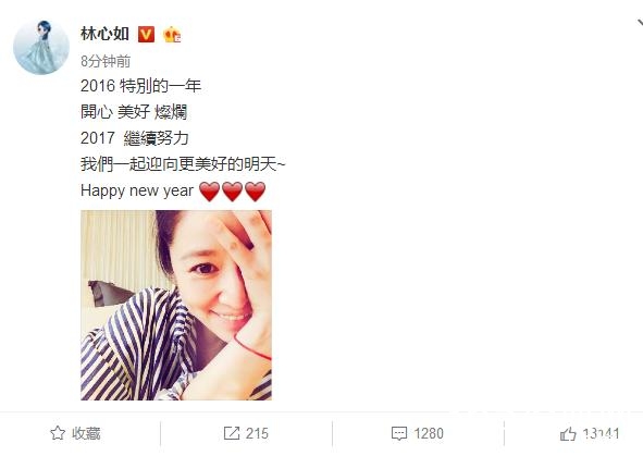 今天下午,“准妈妈”林心如在微博晒出了一张自拍照,并表示:2016,特别的一年,开心、美好、灿烂,2017继续努力,我们一起迎向更美好的明天~happy new year~
