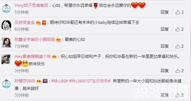 但更多的网友则纷纷送上祝福:“心如,希望你永远幸福,我也会永远爱你的”,“期待你和华哥还有未来的小baby继续这样幸福下去”,“最美的心如”,“祝心如早日顺利产子,祝你和华哥在新的一年里更加幸福和快乐,新年快乐!”