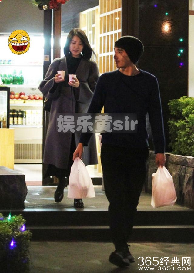 餐毕,赵又廷(右)提着两大袋食物返家,高圆圆拿着两杯热茶跟在后面。