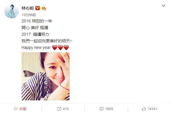 2016年12月31日,2016年的最后一天,林心如发微博纪念,并期待新的一年一切都好,祝大家新年快乐。
