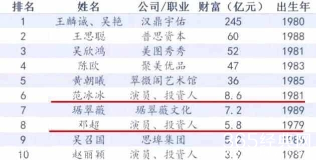 在近日公布的80后富豪榜上,赵丽颖以3.9亿的财富位列第十位,娱乐圈入围的演员共有三位,还有位列第6的范冰冰,身价是8.6亿,位列第8的邓超,身价5.8亿。然后邓超是79年出生的,严格意义上来说应该是70后。