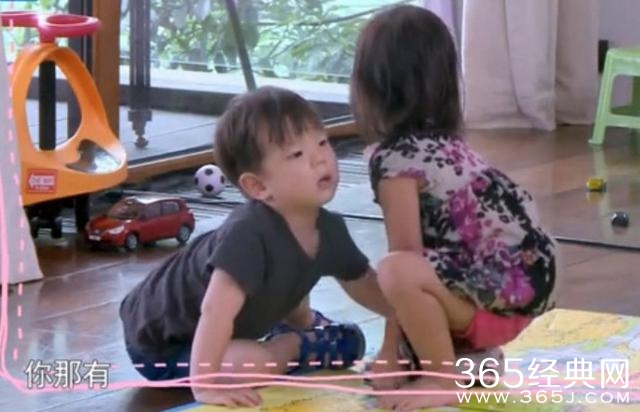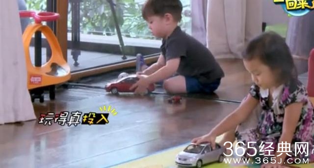 嗯哼和甜馨一起玩耍。各自玩着一部小车。