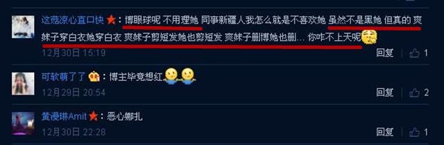 网友这菇凉心直口快:博眼球呢 不用理她 同事新疆人我怎么就是不喜欢她 虽然不是黑她 但真的 爽妹子穿白衣她穿白衣 爽妹子剪短发她也剪短发 爽妹子删博她也删… 你咋不上天呢。
