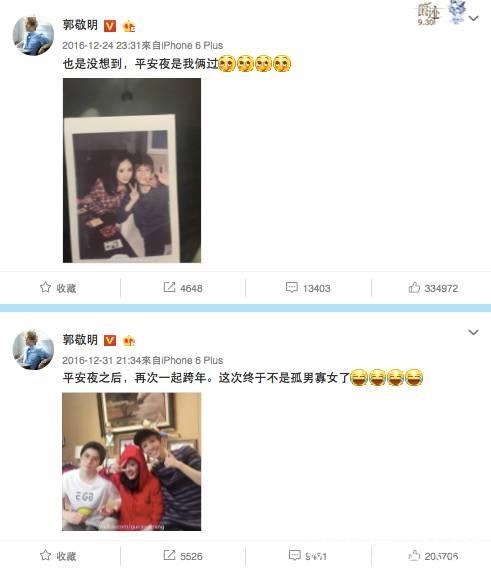 继平安夜“狼人杀合影”后,郭敬明与杨幂照片又一次点亮了跨年夜:“平安夜之后,再次一起跨年。这次终于不是孤男寡女了”。