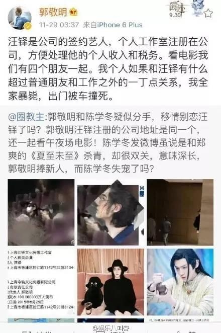 然而,就在一个月之前,曾有营销号爆料称郭敬明与陈学冬疑似“分手”,冬冬从此“失宠”。但郭敬明随即亲自出面辟谣,甚至发毒誓以证明“清白”。