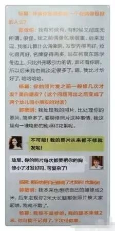 2014年7月,杨幂曾客串《南都娱乐周刊》记者,对郭大导演进行了一系列“采访”和挖掘,一个说对方矮,一个说对方胸太大,俩人互损的对话让人捧腹。