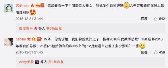 细心的粉丝们甚至统计了杨幂2016年微博发自拍的数量,并对其“不爱发自拍”的行为表示抗议。