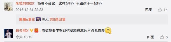 部分网友指责杨幂不顾家:工作再忙,也不能不管刘恺威和小糯米,光和朋友happy呀?圣诞就算了,跨年也丝毫不顾家,有网友甚至表示:“原谅我看不到刘恺威和杨幂的半点儿恩爱。”