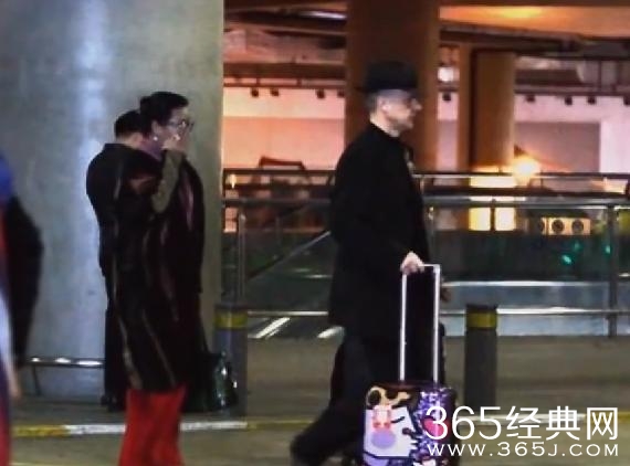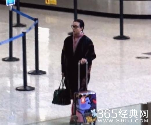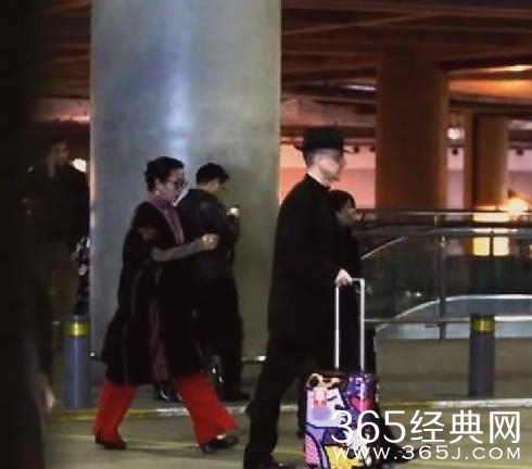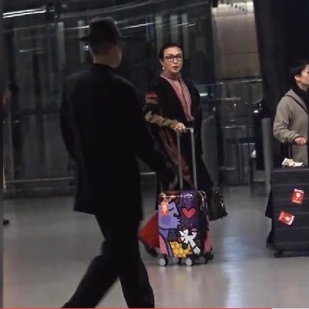 只见金星戴着眼镜,手推行李箱,大红甩裤配以时尚大衣,潮范儿十足。