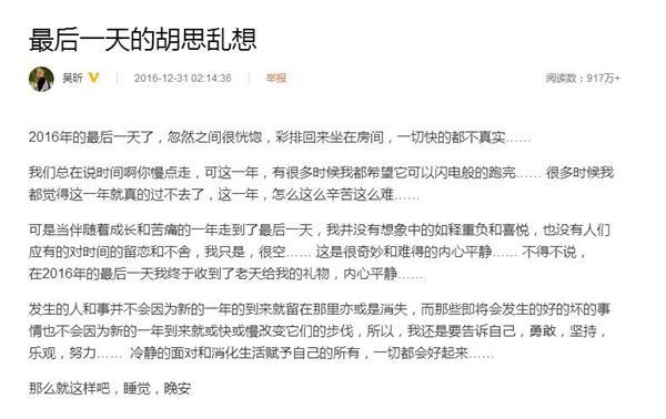 对比江苏卫视的好口碑、浙江卫视的人多势众,芒果台这个跨年晚会的鼻祖似乎不大顺。不但卫视直播的审批没拿下来,杨洋、胡彦斌、黄子韬因为各自的原因临时跳票,演出当晚也因为场馆原因临时毙掉了不少节目,其中亲闺女吴昕的节目都被毙掉了无缘登台。在粉丝看来,这在以往几乎是没法想象的事情,湖南卫视居然拿自己的“亲生女儿”吴昕“下手”。要知道,确实是湖南卫视把吴昕捧出了名,但吴昕这么多年来兢兢业业任劳任怨的劳模精神,也确实在湖南卫视内部也是有口皆碑的。难怪吴昕会觉得委屈,忍不住发了微博抱怨。