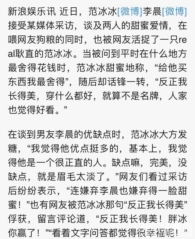 在接受采访的时候,范爷表示自己在给李晨花钱出手最阔绰。随后又说,反正我长得美,穿什么都好看,就算不是名牌,人家也觉得好看。所以范爷这是在秀恩爱还是变相的夸自己,或者是说李晨长得土要用名牌才撑得起?