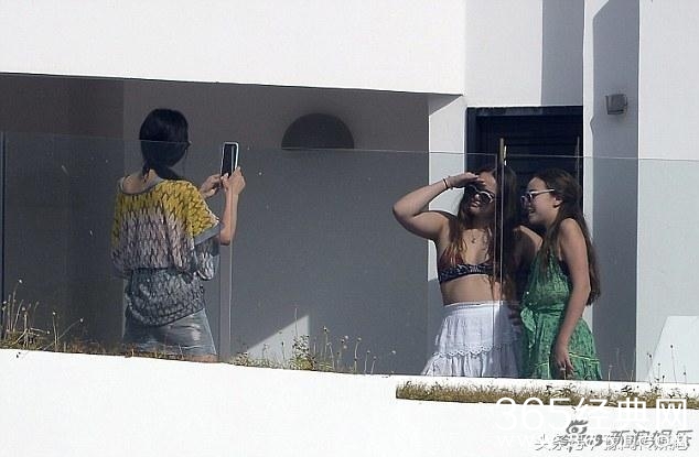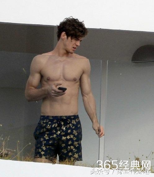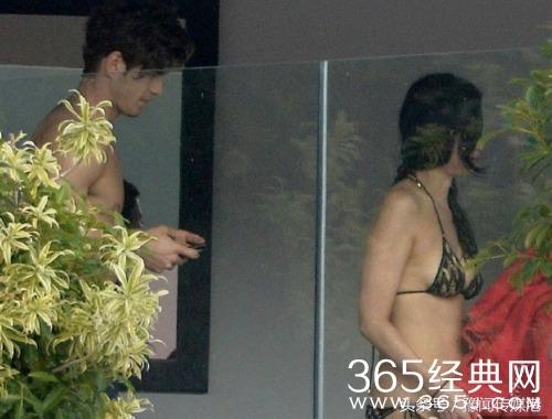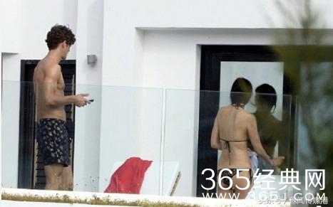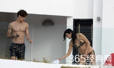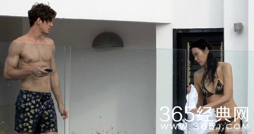 邓文迪与小鲜肉男友。照片中邓文迪身穿黑底金色印花比基尼,与男友的短裤疑似情侣款。