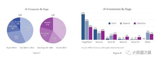 今天,相比于美国同行的一半比率,有四分之三的英国人工智能公司处于他们自身旅程的最初阶段,就是所谓的“种子”或“天使”资金阶段(图7)。另一方面,在每10个英国人工智能公司中只有一个处于晚期“增长资本”阶段,而在美国却是每五个人工智能公司中就有一个。2015年,我们数据可用的最后一个整年,几乎所有有资本输入的英国人工智能公司都还处于天使,种子或A系列阶段,而在全球人工智能领域内,已经有三分之一的公司收到了后期资金(图8) 。