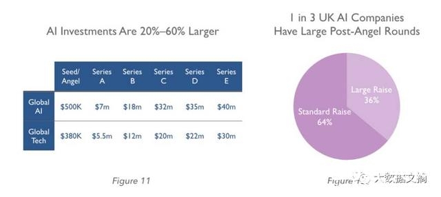 此外,在英国,相当数量的少数公司成功从种子轮次跳到比随后一轮的典型数量大得多的增长(图12,下图)。三分之一的英国人工智能公司在之前的筹资额低于100万美元的情况下,在一轮筹资中募集了超过800万美元。 如上所述,这种动态部分是由人工智能公司的资本要求驱动的,但是人工智能公司中有限数量的有吸引力的投资机会还是只有那么多。与此同时,新生公司的估值预期受收到的“被并购”的邀约支持着 。
