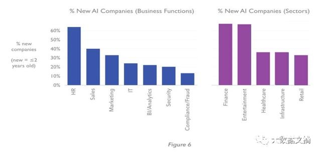 新兴人工智能公司主要集中在哪里呢? 在新兴的人工智能公司中,人力资源业务功能和金融部门所占比例最高(图6)。 三分之二的人工智能人力资源公司和人工智能财务公司还不到两岁。