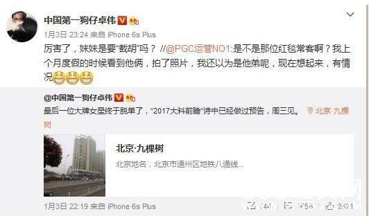 1月3日晚,卓伟发文称“最后一位大牌女星终于脱单了”,顿时引发不少网友的猜测。某网友在评论区留言,称该女星是红毯常客,随后得到卓伟的转发,笑侃这位网友要“截胡”。