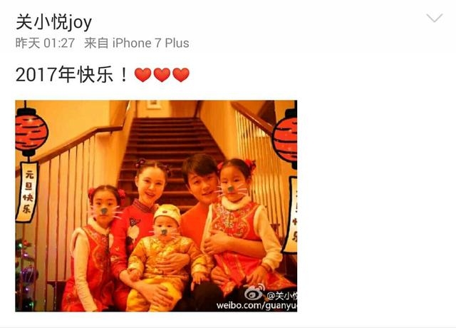 1月2日凌晨,佟大为的妻子关悦在微博晒出了全家福,并祝福2017年快乐!