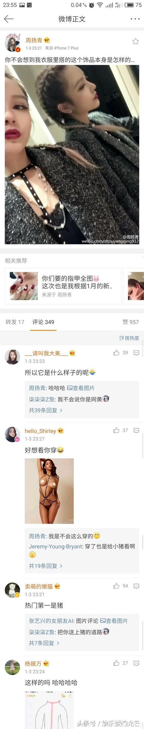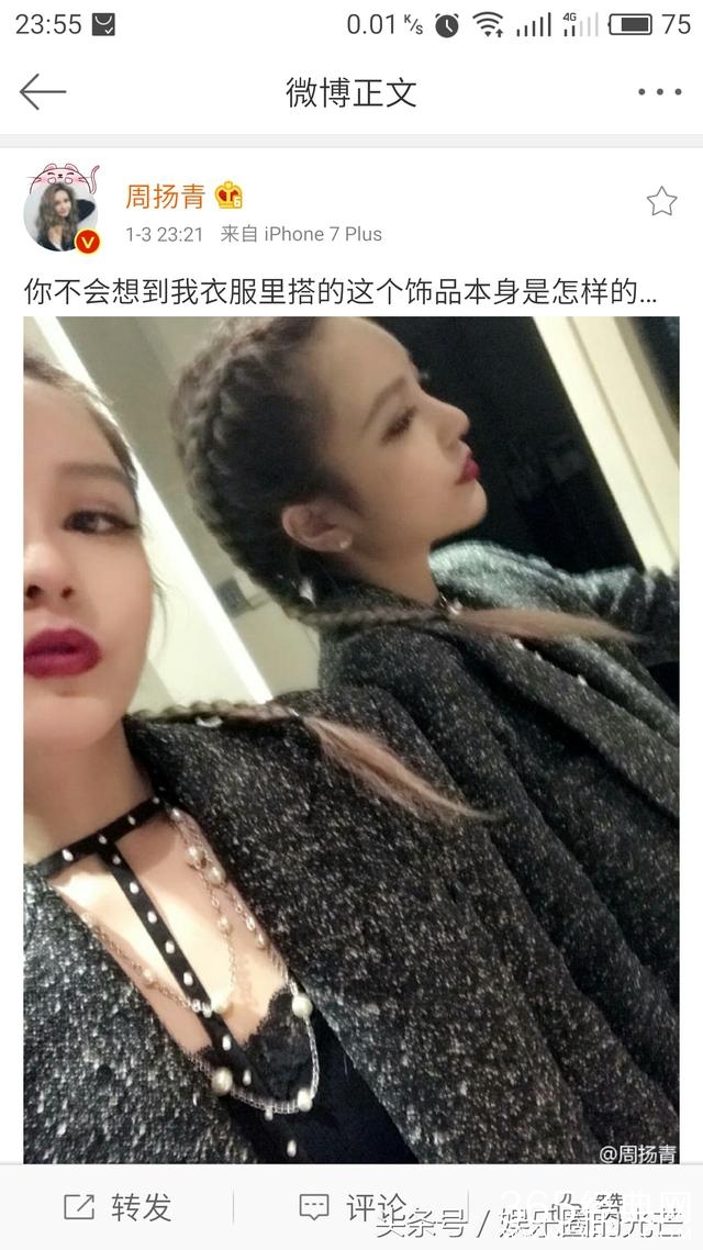 罗志祥女友周扬青半夜更微博到:你不会想到我衣服里搭的这个饰品本身是怎么样的。据网友观察周扬青脖子和胸前是一圈黑色颈环,上面带有类似铆钉物品,整个给人的感觉像极了一件T字形情趣内衣。