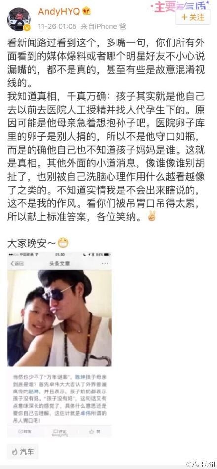 今天上午2点,05点,演员黄奕的前夫黄一庆突然爆发,陈坤的儿子是微博出生时在医院找到一个替代由于人工授精医院的消息,咖喱鸡蛋鸡蛋是人们捐赠,所以陈坤不守口如瓶,但他并不知道,媒体爆料,明星朋友不小心说漏嘴了,是故意混淆视线。