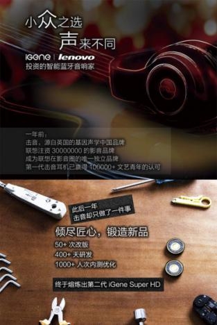 击音耳机(英文名:iGene),是包括联想和全球知名耳机生产商注资成立的敲敲科技(北京)有限公司创立的品牌,定位如同蓝牙耳机领域的Zara,专注为年轻一代的移动影音爱好者,提供自由畅快的音乐听感,操控和功能体验,是蓝牙耳机换代传统耳机的实践者和推动者,将蓝牙音频与无线音乐完美融合。“声来不同”是击音耳机的产品基因。击音耳机为新声代开创焕然一新的听觉体验。除了发掘创新的HiFi音质,击音耳机更强调“无线自由”的操控体验,不仅创新了蓝牙音频技术,而且“严禁”所属产品的按键数量,所有操控,只需敲敲,划划,触摸等手势即可实现。