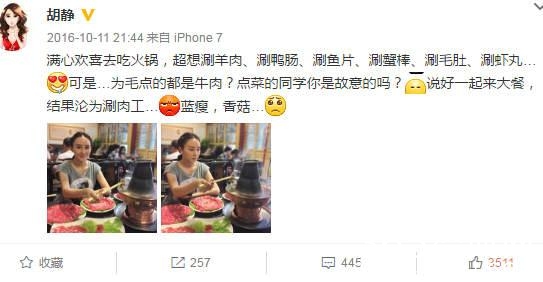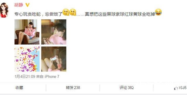昨晚上,胡静又在晒自己的生活照啦,照片中她正在打游戏,说是自己痴迷游戏都忘记做饭了