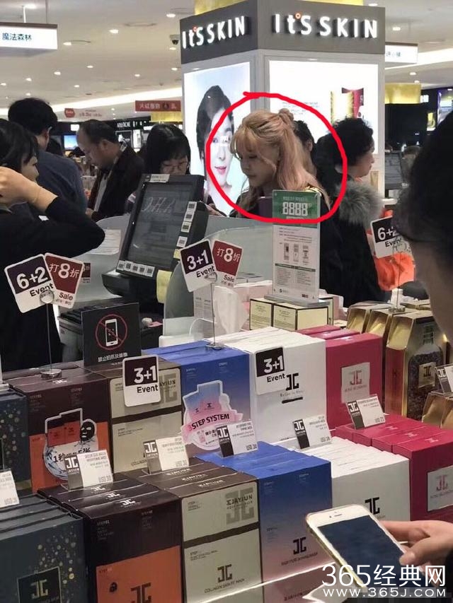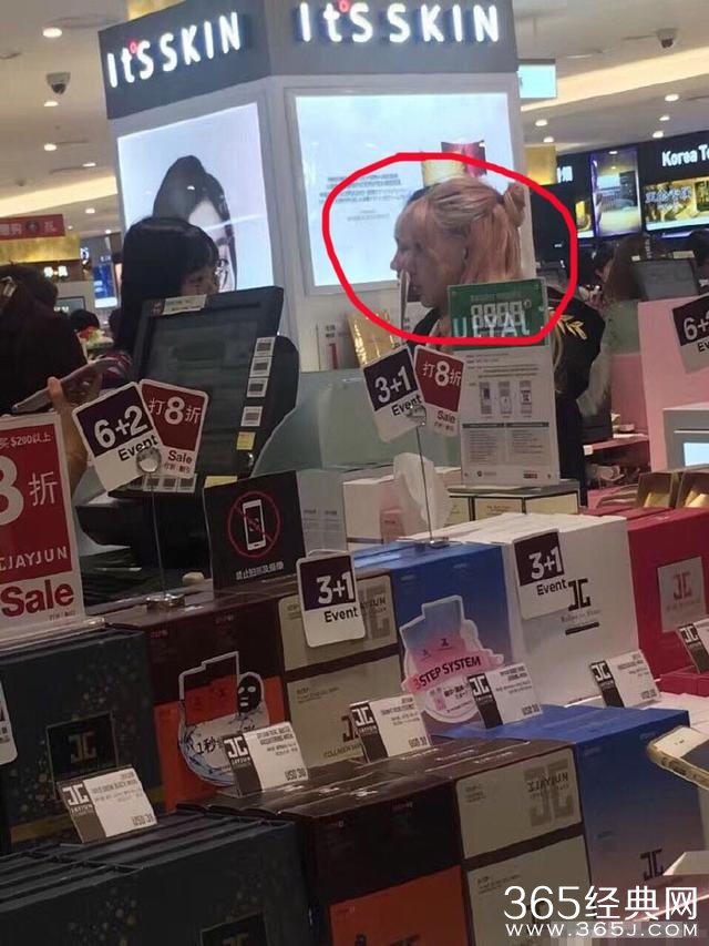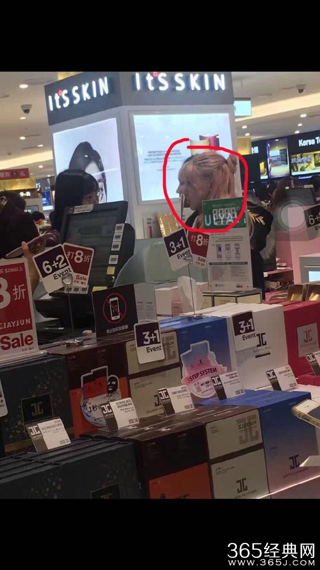 从照片看,在韩国的某商店中,正在选购商品的韩安冉,依然是她那套标志性的芭比粉色头发,很是显眼。