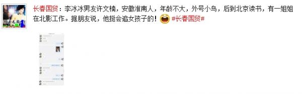 今日,有网友在微博爆料自己的朋友认识李冰冰男友许文楠,安徽淮南人,年龄不大,外号“小鸟”,后到北京读书,有一姐姐在北影工作。据朋友说,他挺会追女孩子的!